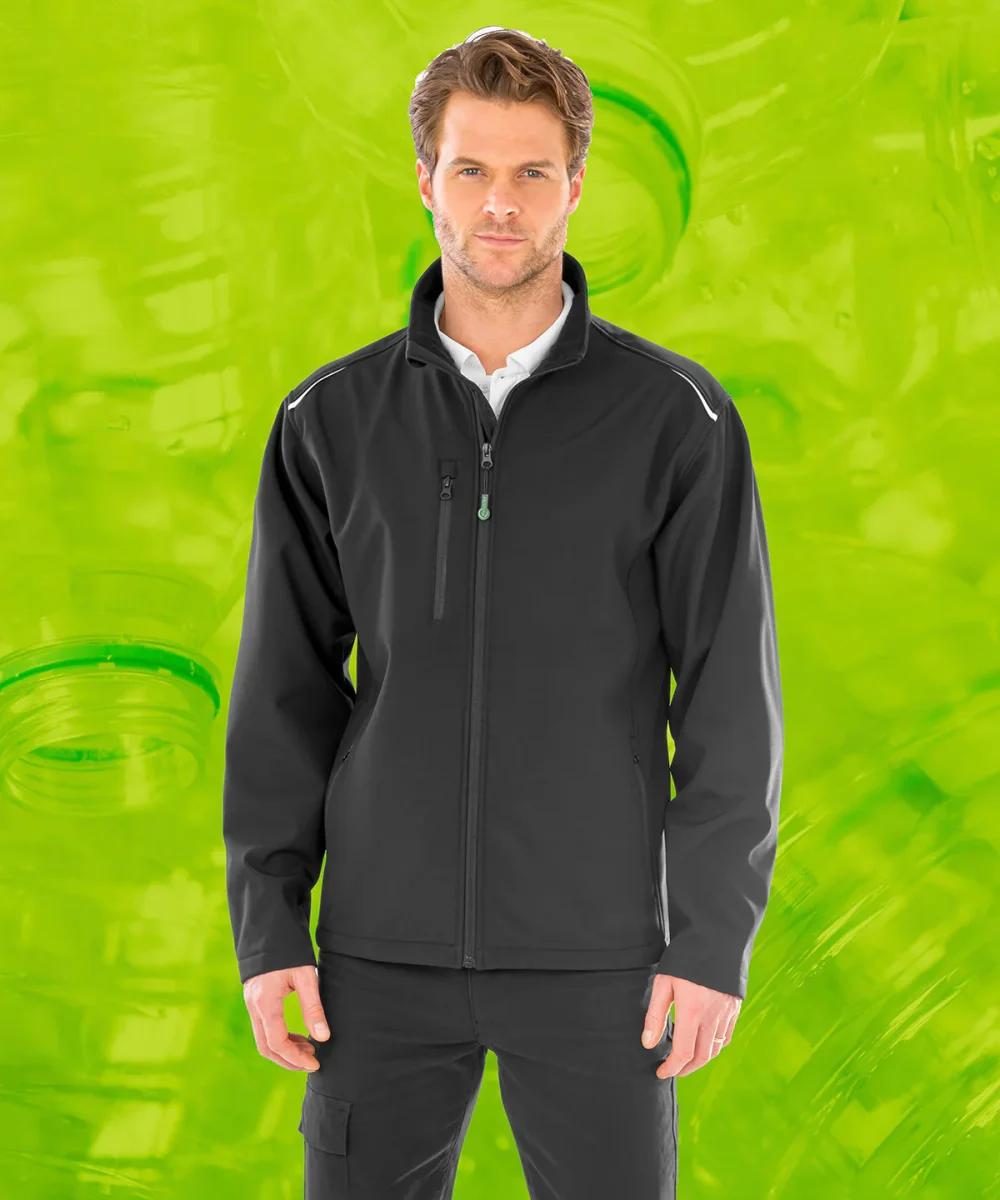 Upptäck vår mjuka och återvunna softshelljacka för herrar. Denna jacka är perfekt för olika typer av dekorationer, inklusive tryck. Med sitt 3-lagers mekaniska garn erbjuder den optimal komfort och hållbarhet. Den är vattentät upp till 8000 mm, samt både andningsbar och vindtät tack vare det speciella TPU-membranet.