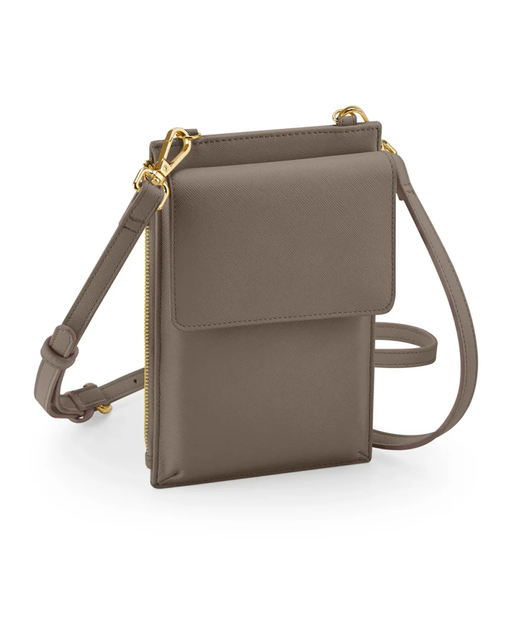 Skydda din teknik med stil med vårt eleganta telefonfodral. Det är designat för att bäras antingen som en cross-body eller axelväska, tack vare den mångsidiga och utbytbara axelremmen. Fodralet har en knäppning som säkerställer att din telefon är tryggt förvarad, och en praktisk dragkedjeficka där du kan förvara nycklar, kort och andra småsaker.