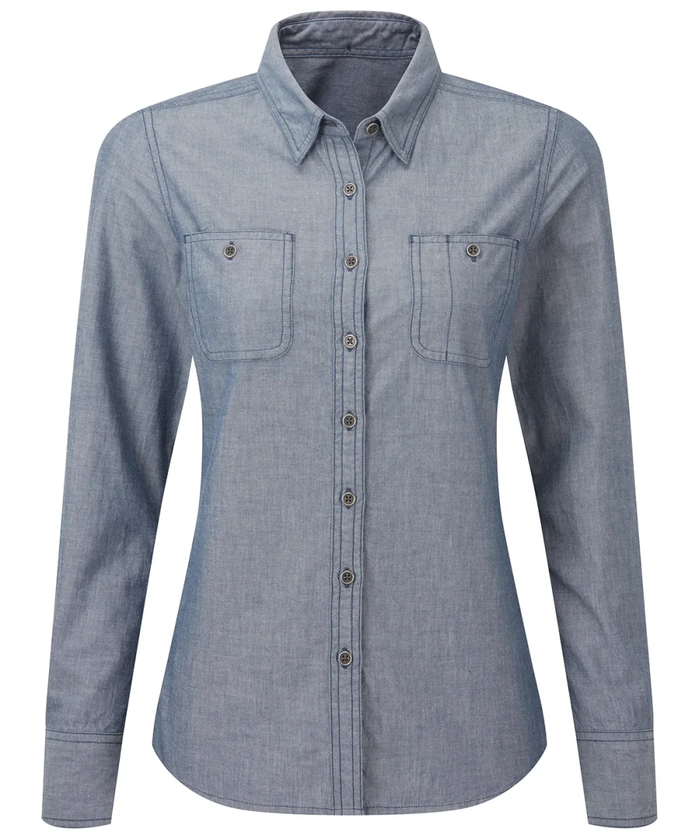 Upptäck den eleganta damchambrayskjortan i ekologisk och Fairtrade-certifierad bomull. Denna skjorta kombinerar stil och hållbarhet, vilket gör den perfekt för den medvetna kunder. Skjortan har en sofistikerad chambray-finish och tvillingnålssömmar som sträcker sig från manschetter och ärmar till krage, knappslå och bröstfickor, vilket ger både stil och extra hållbarhet.