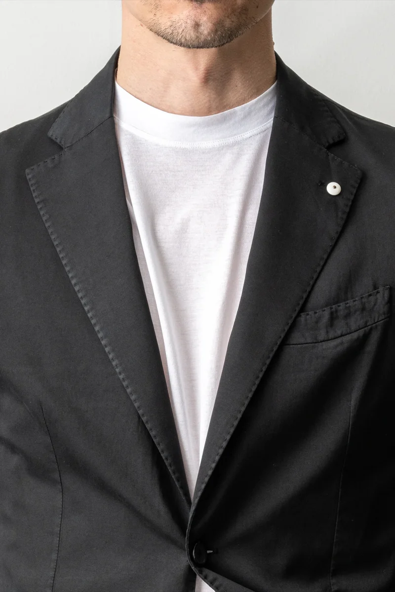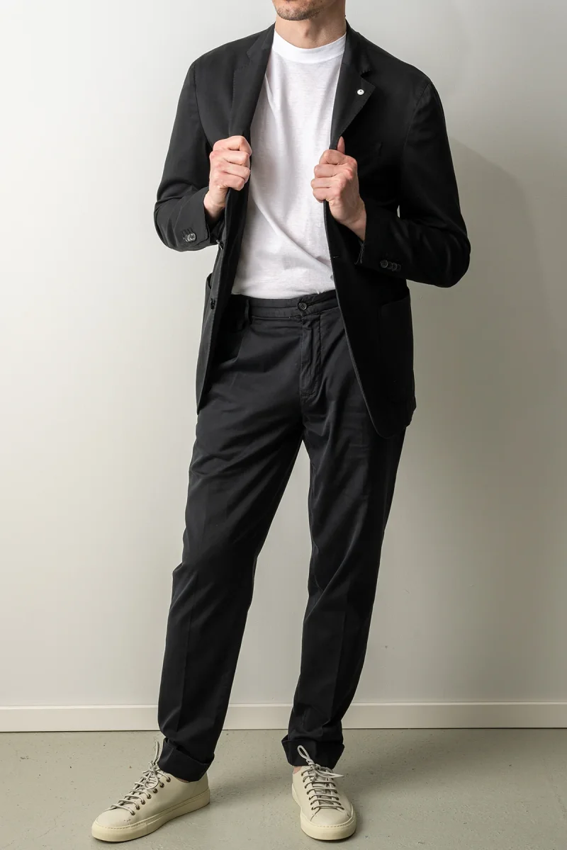 L.B.M. 1911 presenterar en stilren kavaj i svart som kombinerar italiensk elegans med modern funktion. Tillverkad i en exklusiv blandning av bomull och silke erbjuder den en mjuk, lätt känsla med subtil lyster – perfekt för dig som söker både komfort och sofistikation.