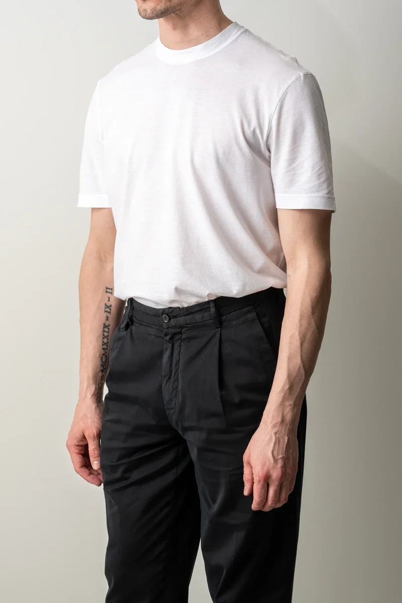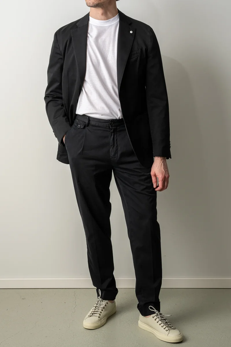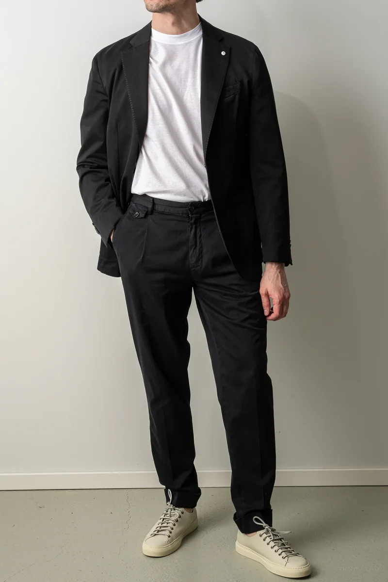 LBM 1911 presenterar ett par eleganta svarta byxor som kombinerar italiensk finess med modern funktionalitet. Tillverkade i en exklusiv blandning av bomull och silke erbjuder de en mjuk känsla mot huden samtidigt som materialet ger en lätt lyster och hög komfort hela dagen.