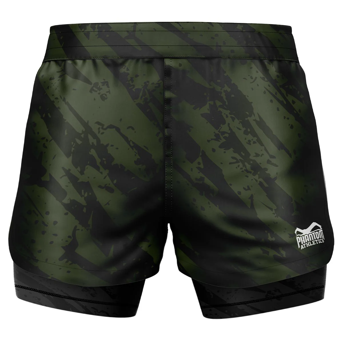 Die ”Fusion 2in1” Fightshorts verfügen über eine zusätzliche innenliegende Kompressionshose und somit ultimativen Tragekomfort. Hier im army grünen Tiger Look.