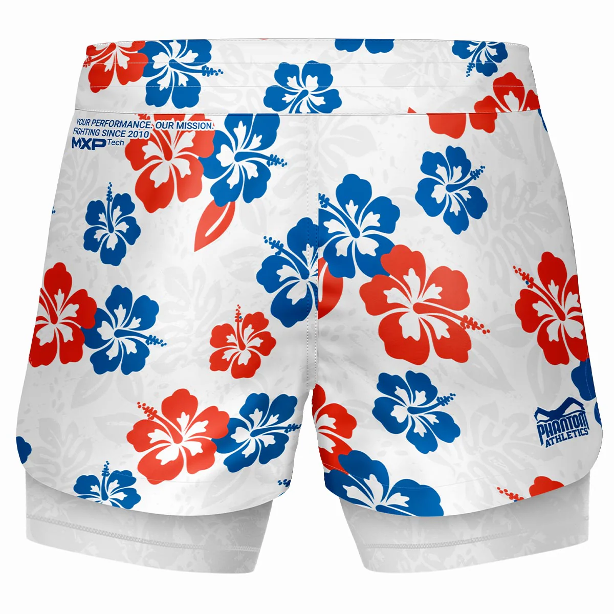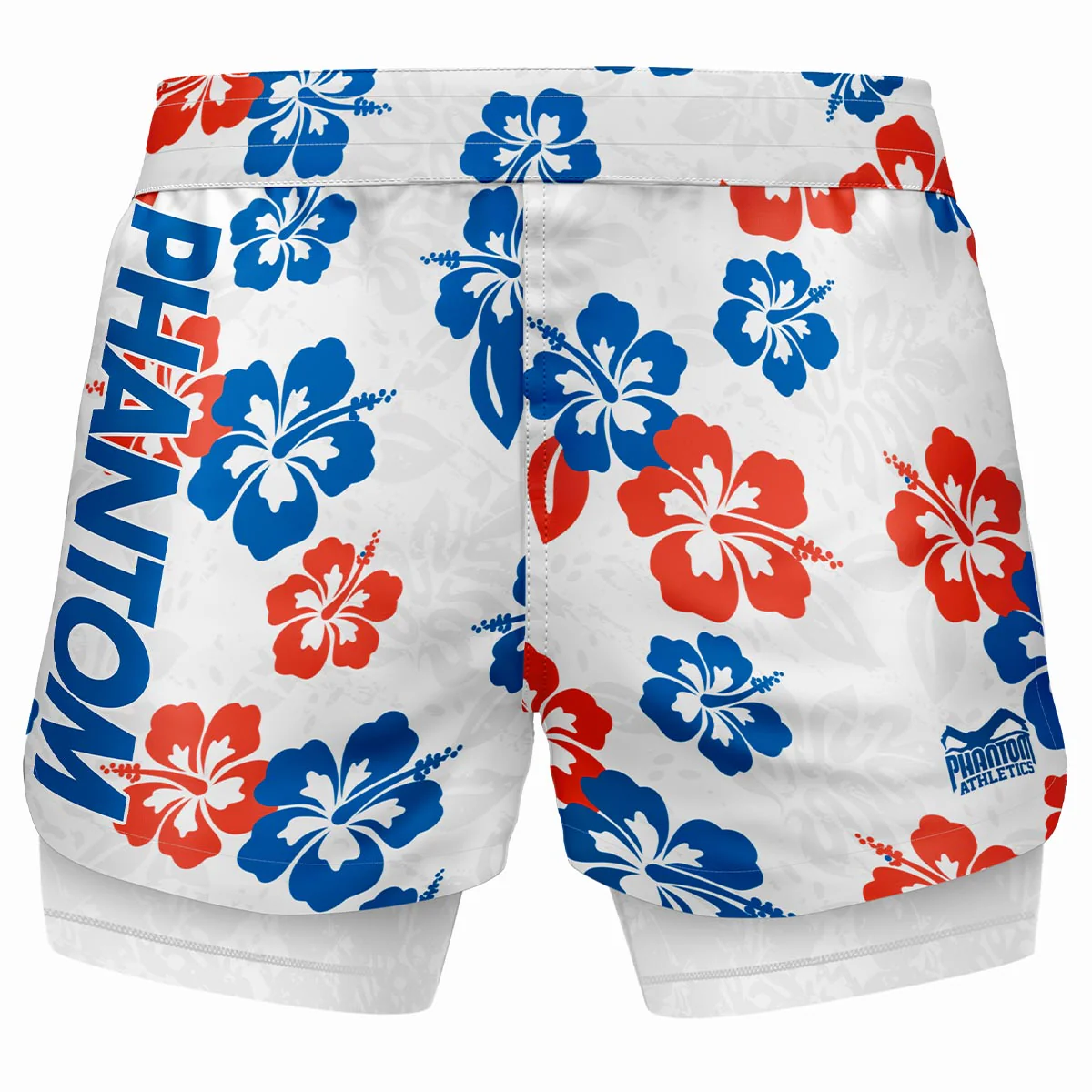 Die ”Fusion 2in1” Fightshorts verfügen über eine zusätzliche innenliegende Kompressionshose und somit ultimativen Tragekomfort. Hier im freshen Hawaii Look.
