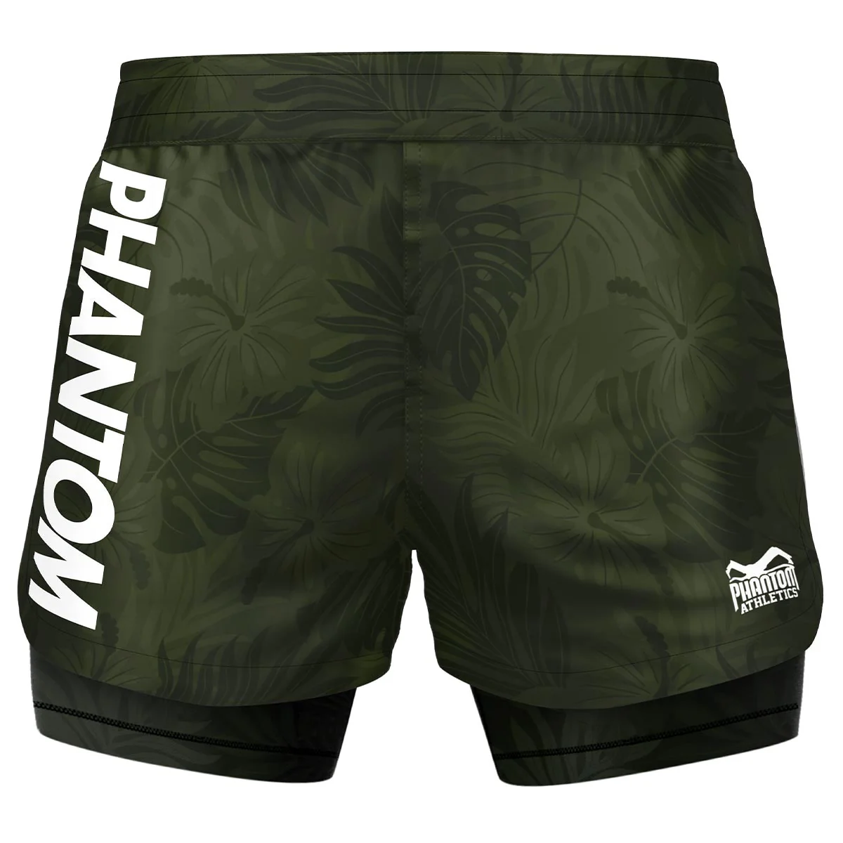 Die ”Fusion 2in1” Fightshorts verfügen über eine zusätzliche innenliegende Kompressionshose und somit ultimativen Tragekomfort. Hier im army-grünen Jungle Look.