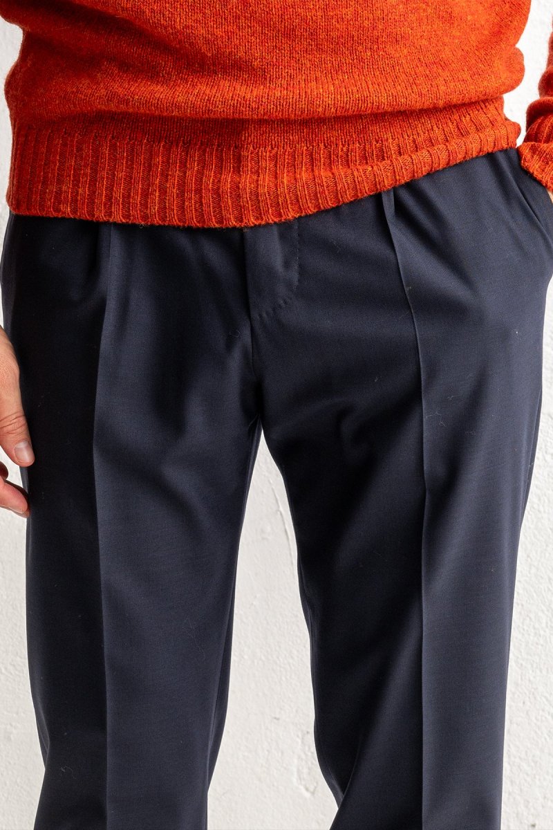 PT Torino levererar tidlös elegans med denna byxa i mörkblå ull av högsta kvalitet. Tyget har en mjuk struktur som ger en sofistikerad look och en behaglig känsla mot huden – perfekt för både kontor och fritid.