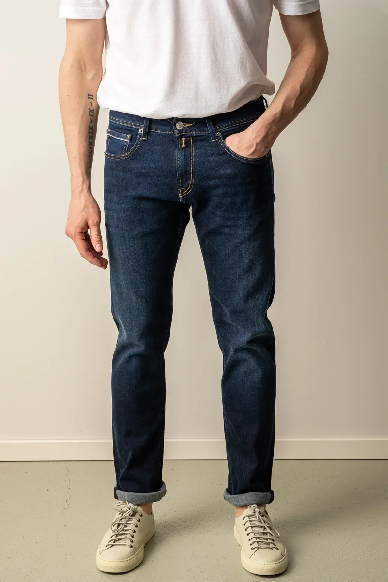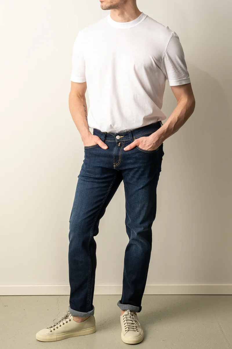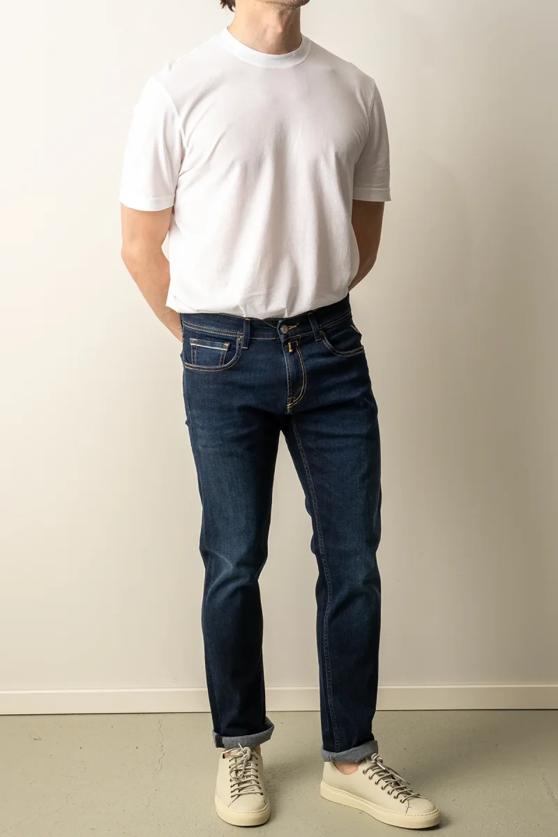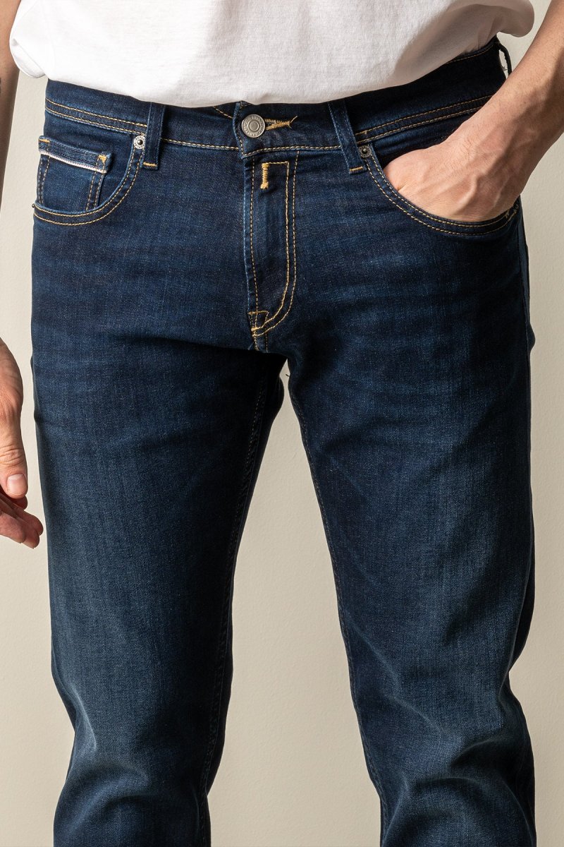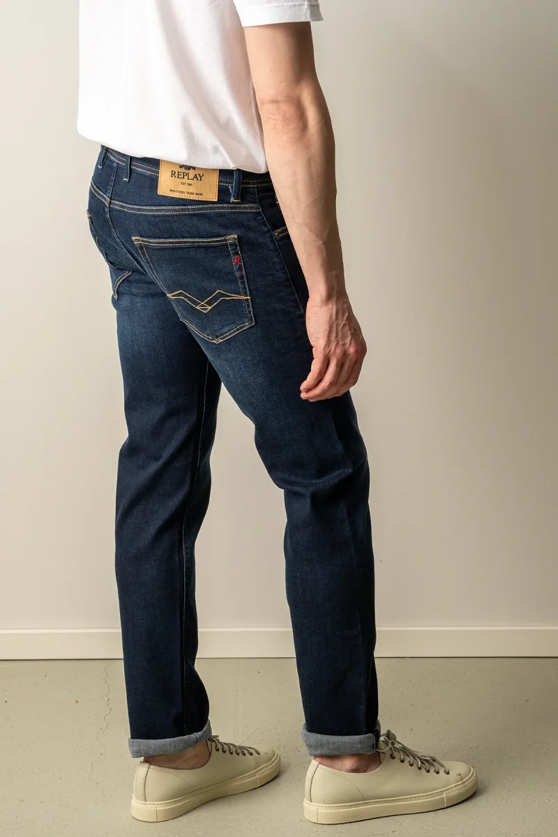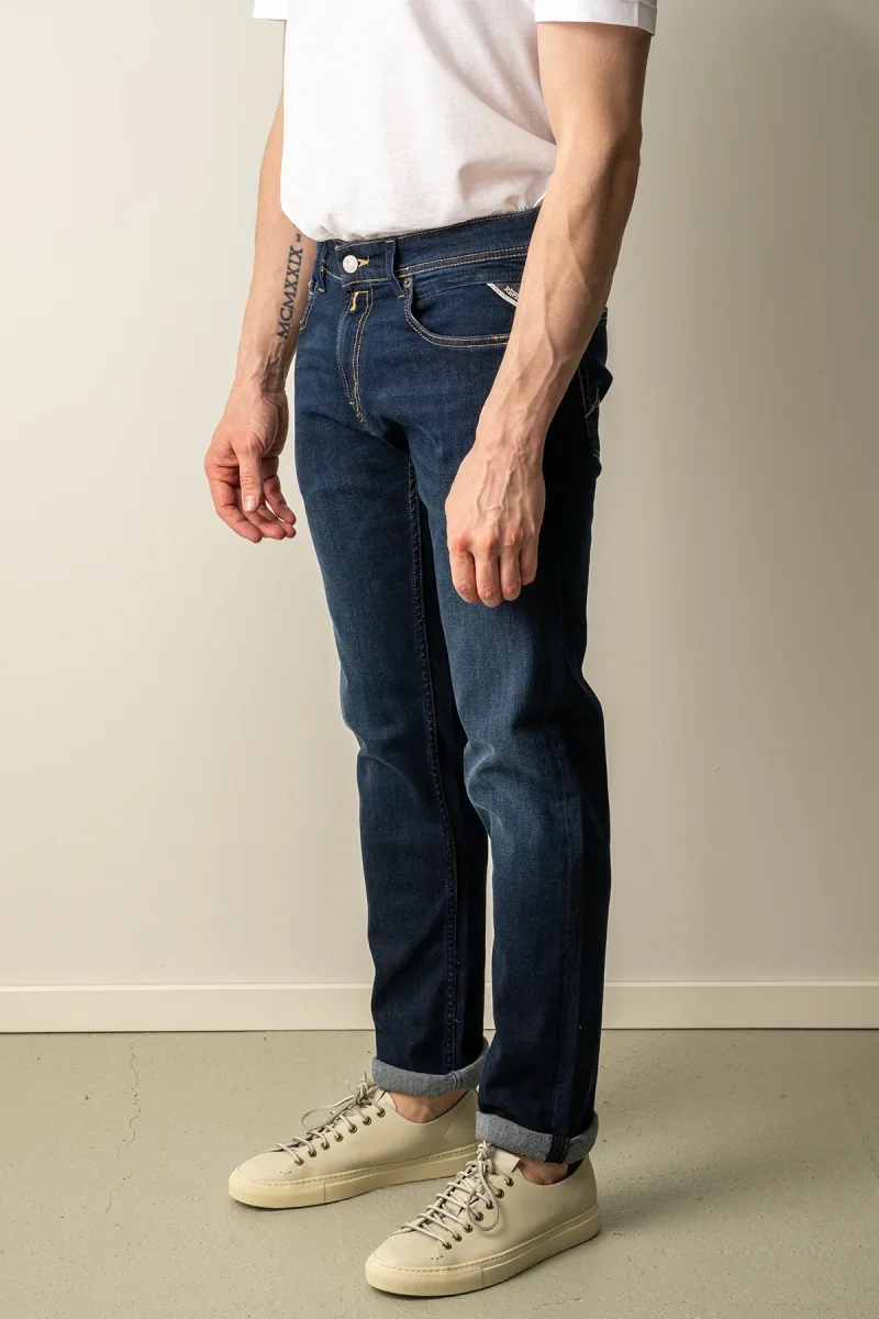Replay presenterar ett par klassiska jeans i mörkblå tvätt, tillverkade i mjuk bomull med en lätt stretch för optimal komfort och rörelsefrihet. Den genomarbetade denimkvaliteten ger en följsam känsla och en snygg siluett som håller formen över tid.