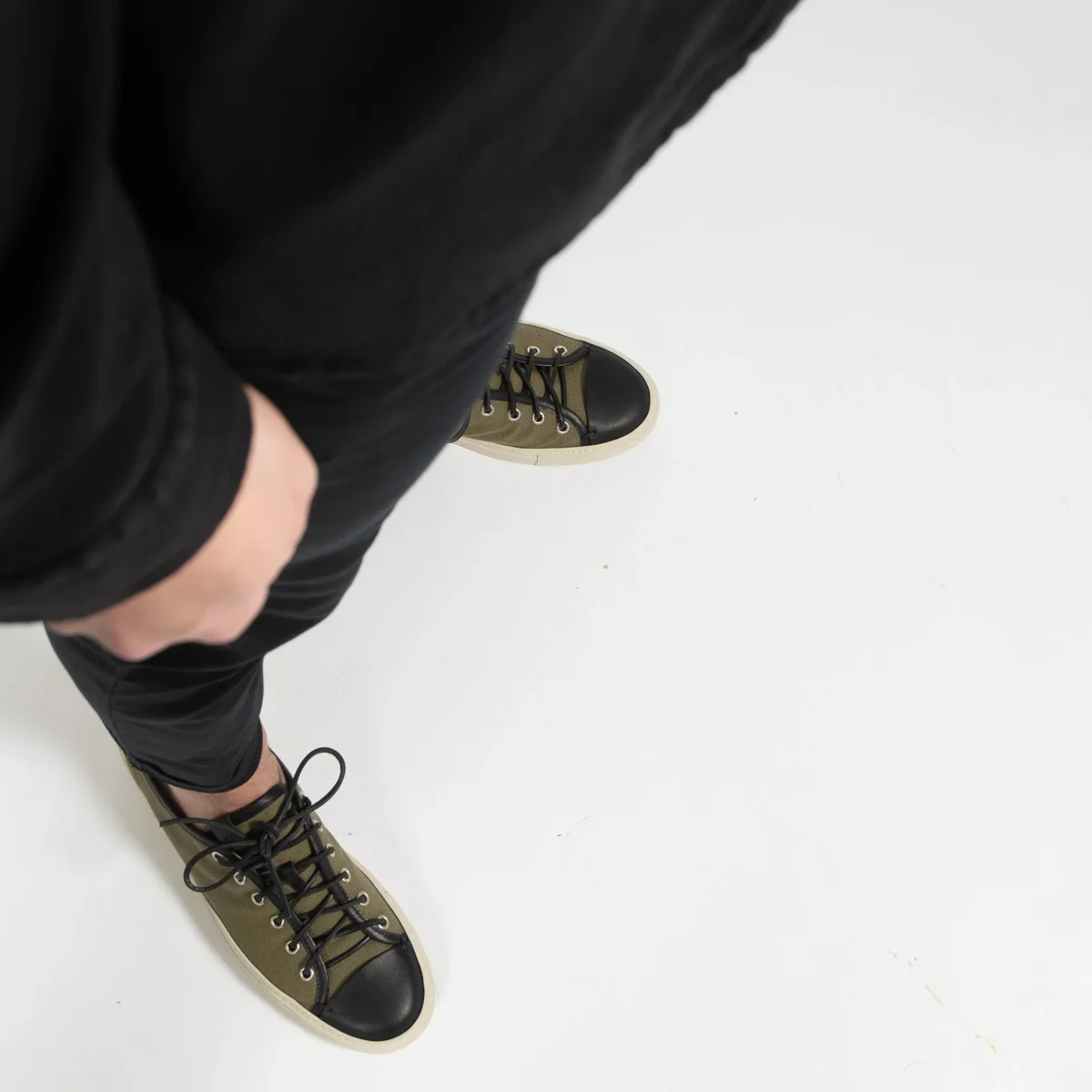 • Skon är sydd i kanvas och har läderdetaljer. Skon stängs med matchande lädersnören och extra tygsnören medföljer.