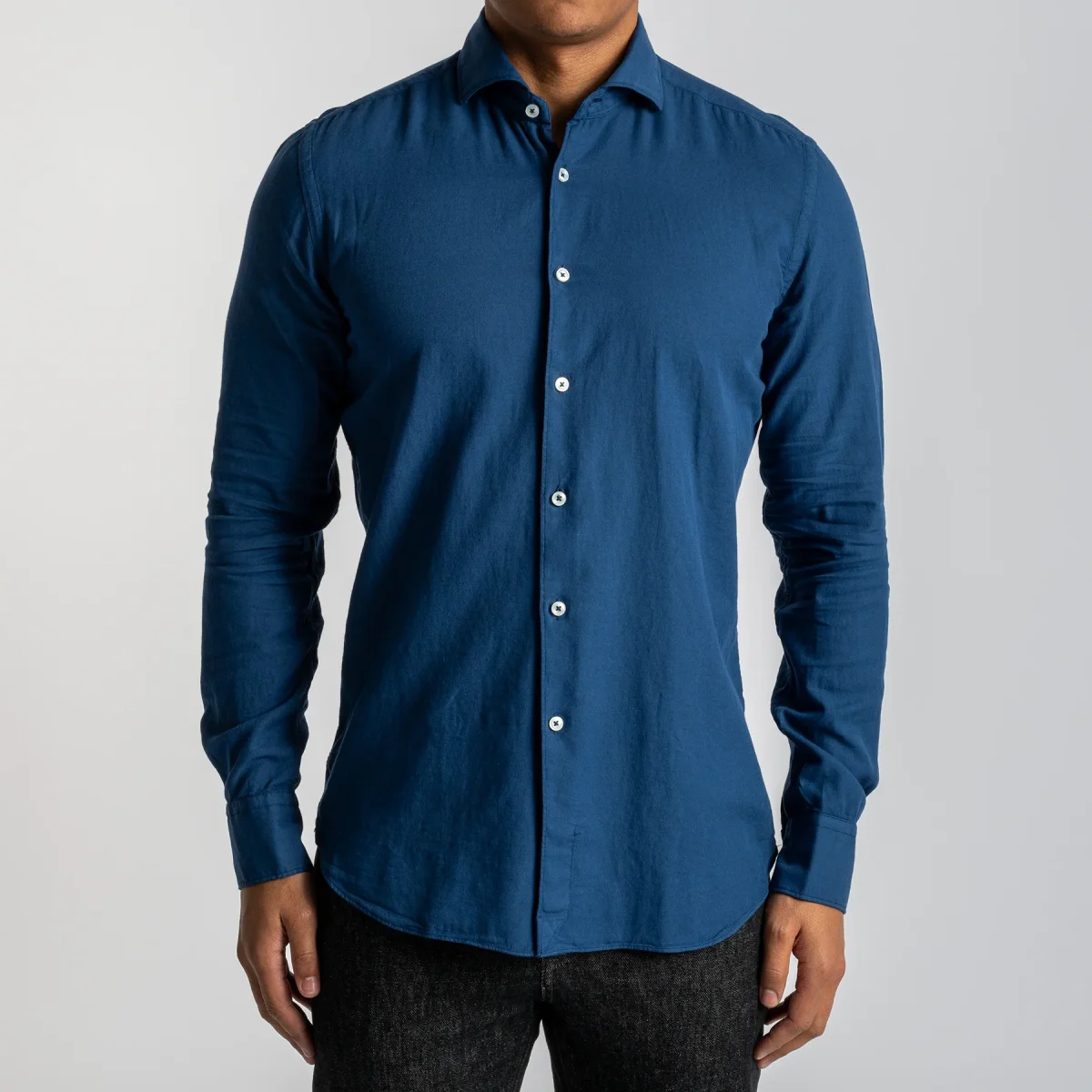 • Skjortan stängs med pärlemoknappar och har en klassisk krage. Skjortan är svagt slimmad i modellen.
