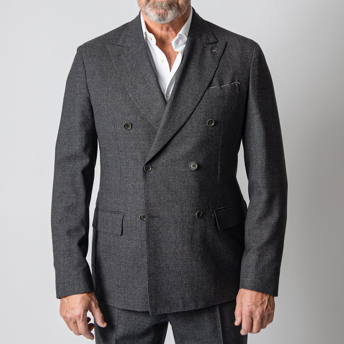• Kostymen har en jacka med två stycken sidfickor med ficklock och en bröstficka på vänster bröst. Kavajen stängs med mörka pärlemoknappar och har bred peak-lapel. Byxan är hög i midjan och har ett enkelt frontveck och är succesivt avsmalnande ner till fotlsutet.
