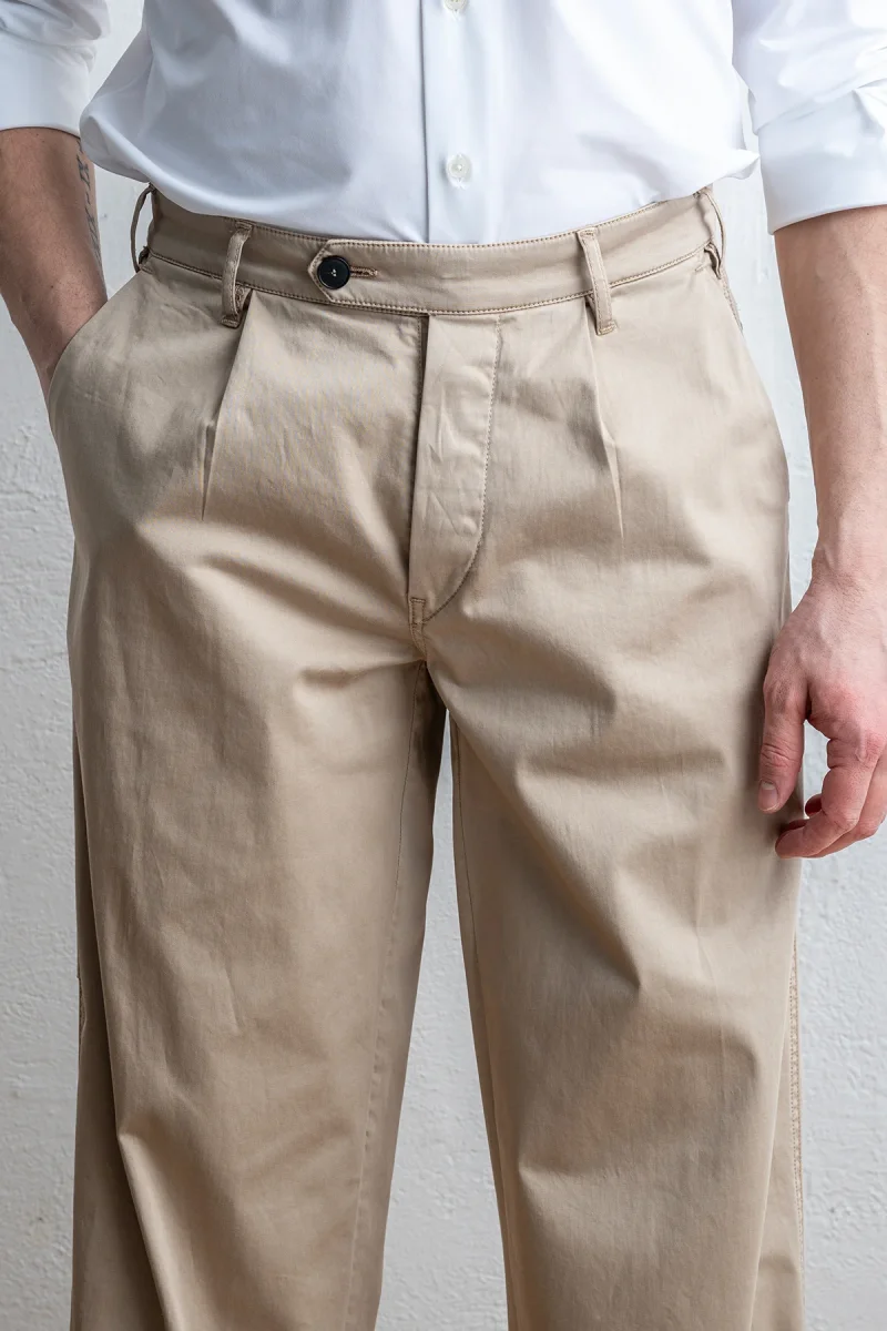 • Byxan är hög i midjan och bred över låren ner till ett normalbrett fotslut. Byxan har enkelt frontveck, två stora lappade fickor med lock baktill som stängs med knapp och två snedställda fickor vid höften.