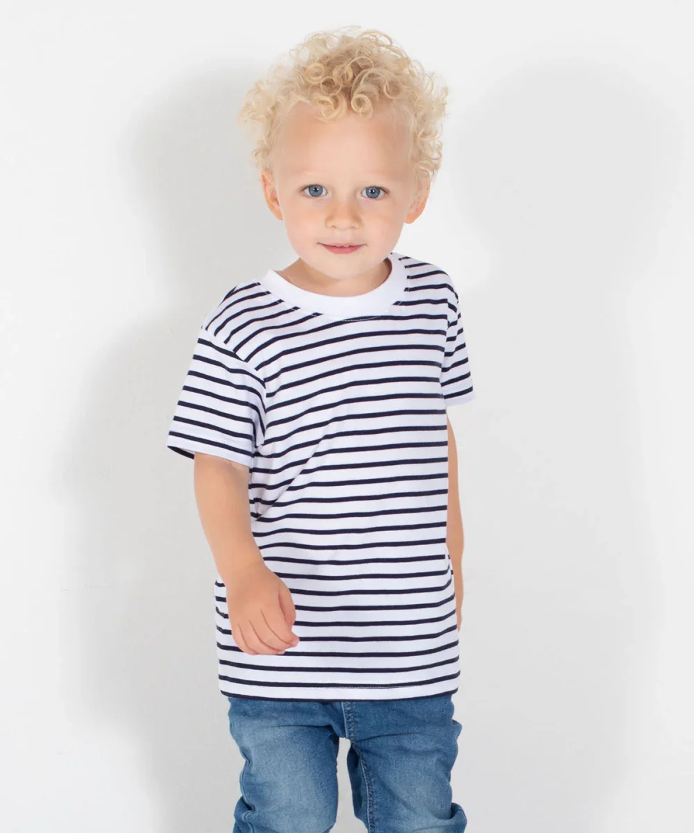 Den kortärmade randiga t-shirten är den perfekta klädnaden för alla tillfällen. Tillverkad av mjuk 100% bomull erbjuder den stora möjligheter för tryck och broderi. Den etikettfria designen gör det lättare att märka om produkten, vilket gör den extra praktisk.