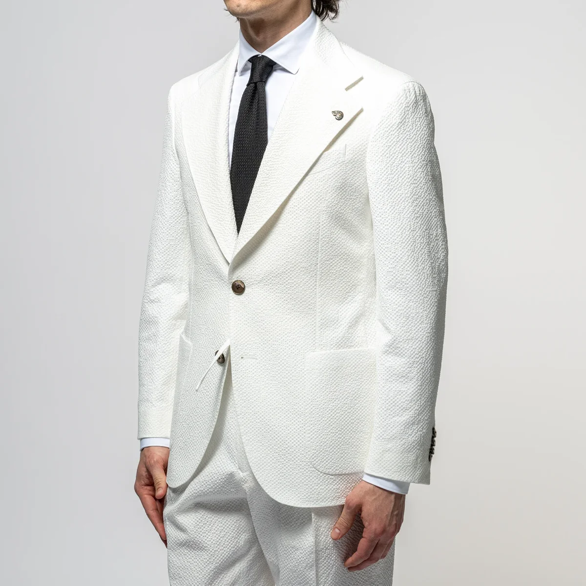 • Kavajen stängs med pärlemorknappar och har breda slag. Kavajen har en något avsmalnande passform med två sidfickor samt en bröstficka.