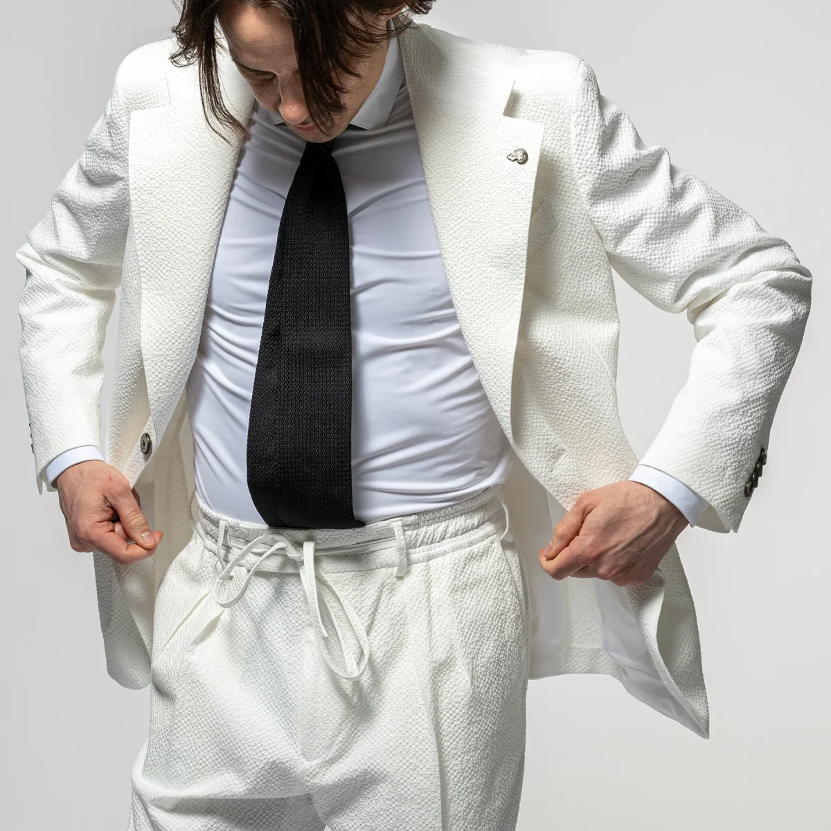 • Blazern är sydd i en fin strukturerad bomulls kvalité med lite elastan för bekvämlig passform. Till blazern finns även en tillhörande drawstring byxa.