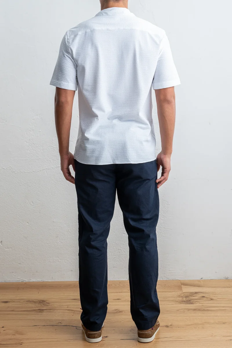 • Skjortan stängs med pärlemoknappar och har en klassisk bowling krage. Skjortan är svagt slimmad i modellen.
