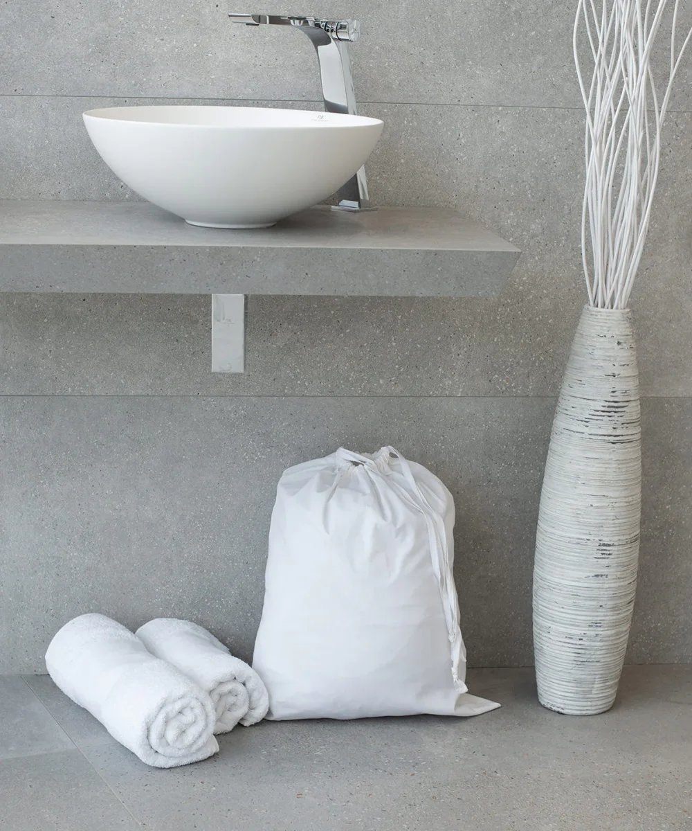 Upptäck den perfekta lösningen för att hålla ordning på din tvätt med vår stilrena tvättsäck i bomull. Med sin klassiska design smälter den enkelt in i alla hem. Den är utrustad med en smart snörning, vilket gör det lätt att stänga och hålla smutstvätten borta från synen.