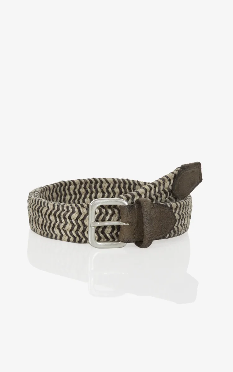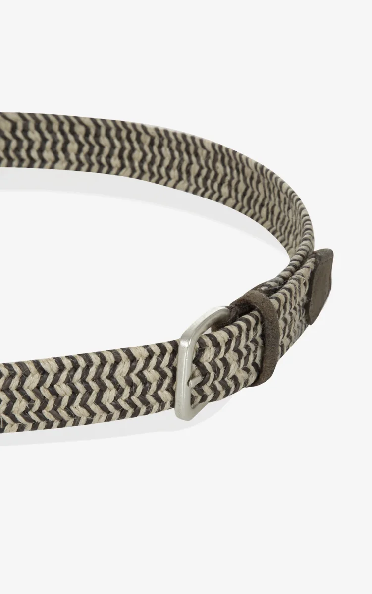 • Bältet är vävt och har ett silvrigt spänne. Bältet är vävt i bomull och läder.