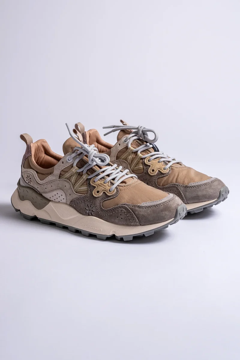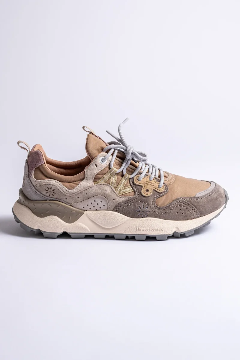 Flower Mountain signerar dessa sneakers i grey/mud/offwhite med en harmonisk mix av nylon och mjuk mocka. Ovandelen andas, medan de robusta panelerna ger struktur och en tidlös, urban känsla.
